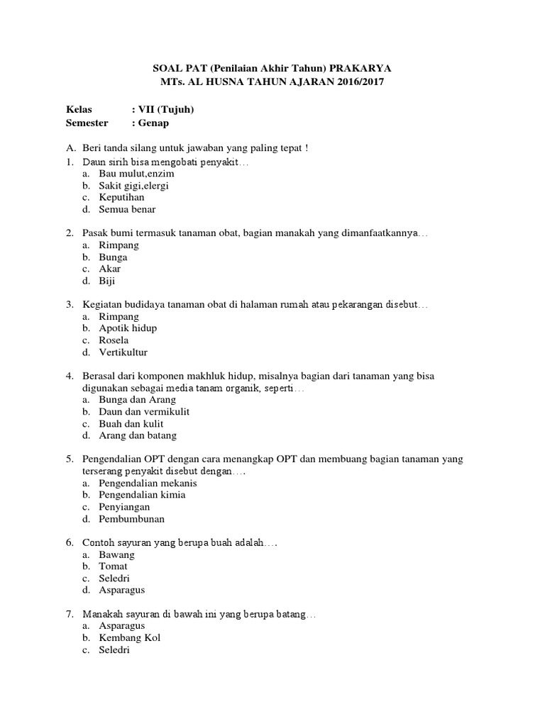 Latihan soal uts pts bahasa indonesia kelas 7 semester 2 kurikulum 2013 beserta kunci jawaban. Pada kesempatan kali ini saya akan berbagi latihan soal untuk mapel prakarya kelas 7 smp/ mts semester 2 dalam bab kelima yaitu pengolahan bahan pangan hasil samping sayuran menjadi produk pangan. Sebagaimana yang kita ketahui bersama bahwa. • #latihansoal #videopembelajaran video latihan soal kali ini membahas soal uts pts prakarya kelas 7 semester 2 kurikulum 2013 beserta kunci. Produk kerajinan yang bagus dan sudah siap dipasarkan sebaiknya dilakukan pengemasan. Kurikulum acuan tahun pelajaran bentuk soal alokasi waktu. Tulislah terlebih dahulu identitas (nama, kelas, dan nomor peserta) pada lembar jawaban. Kunci jawaban buku wajib matematika kelas 7 semester 1 bab 2 himpunan. Berikut bospedia memberikan soal uas prakarya kelas 7 smp/mts. Soal yang admin bagikan pada kesempatan artikel ini untuk persiapan kegiatan ulangan dan penilaian pada kelas 7 jenjang smp dan mts. Documents similar to soal uh 1 prakarya kelas 7 semester 2.docx. Inilah pembahasan selengkapnya mengenai soal prakarya kelas 7 semester 2 dan kunci jawaban. Smp negeri 1 kesamben :